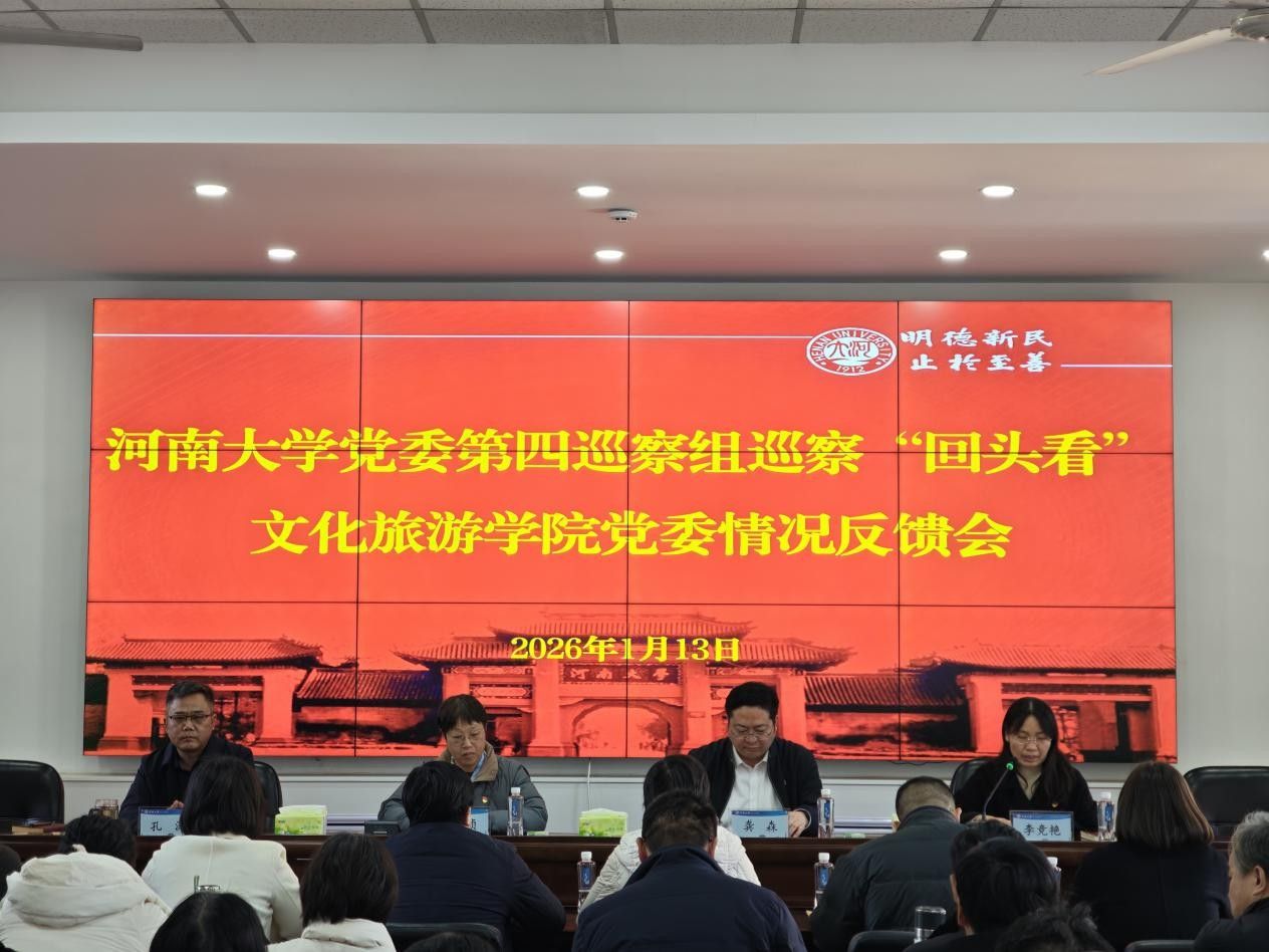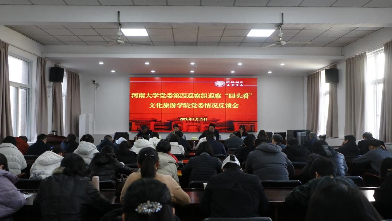 1月13日下午,校党委第四巡察组对文化旅游学院党委巡察“回头看”情况反馈会在文化旅游学院202会议室召开。校党委巡察工作领导小组成员、巡察办负责人胡春贞,校党委第四巡察组全体成员,文化旅游学院全体教职工、离退休教师代表和学生代表参加会议。会议由学院党委副书记、执行院长李竞艳主持。
