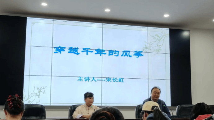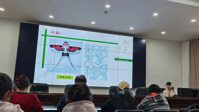 聘任仪式后,宋长虹老师借古诗“儿童散学归来早,忙成东风放纸鸢”开场,展示了风筝文化的源远流长,并用福寿双全、龙凤呈祥、儿女双全、日进斗金等成语介绍了传统风筝文化中的美好寓意。随后,宋老师隆重介绍了她的代表作“双头鹦鹉”风筝作品,并向同学们解读其中委婉含蓄的美好爱情。