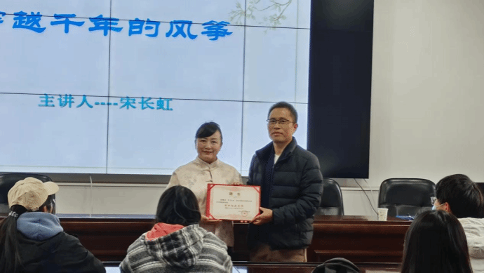 会议伊始,由刘英钦为宋长虹颁发就业创业导师聘书,诚邀其为文化旅游学院创业就业导师,感谢其对我院学子的悉心指导。