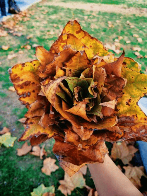 漫步于铁塔湖畔,志愿者们在进行清扫活动的同时还不忘去发现美。一片片形状各异的落叶,是秋天的礼物,令人感慨自然的鬼斧神工。志愿者们将落叶拾起,制作出落叶玫瑰花,与自然联结,与心灵共舞。