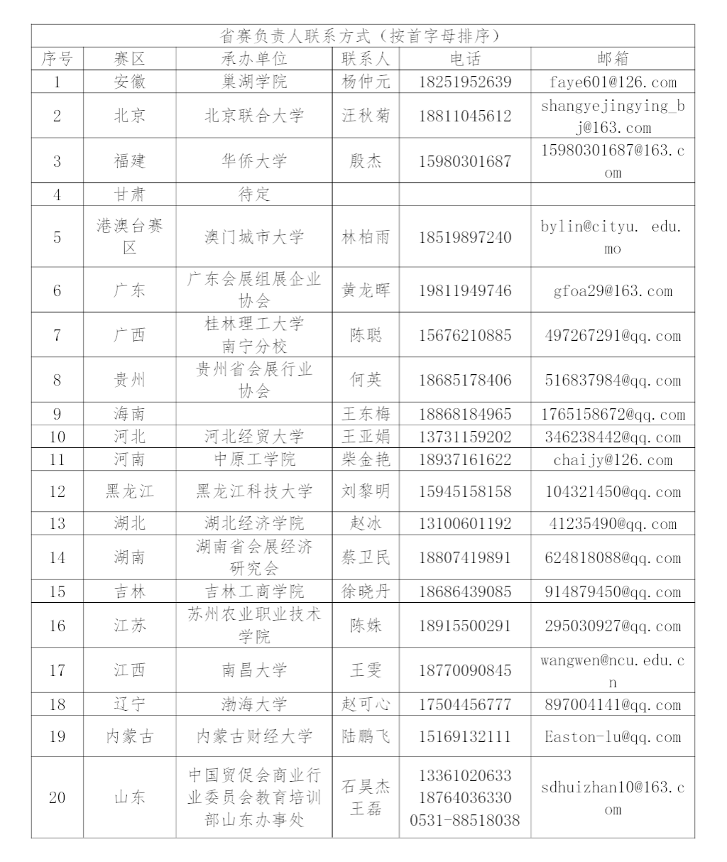 未设立省赛区的省(市)可由本(市)相关政府部门、协会、院校或企业经申请设立赛区,并成立赛区组委会,负责本赛区的竞赛组织工作。凡有意申请设立赛区的单位可登录竞赛网站(ccpit.moocollege.com或www.52mice.com),查询申请条件,下载申请表格或向执委会索取,填写后发送至974565542@qq.com邮箱或邮寄、传真至竞赛执委会。