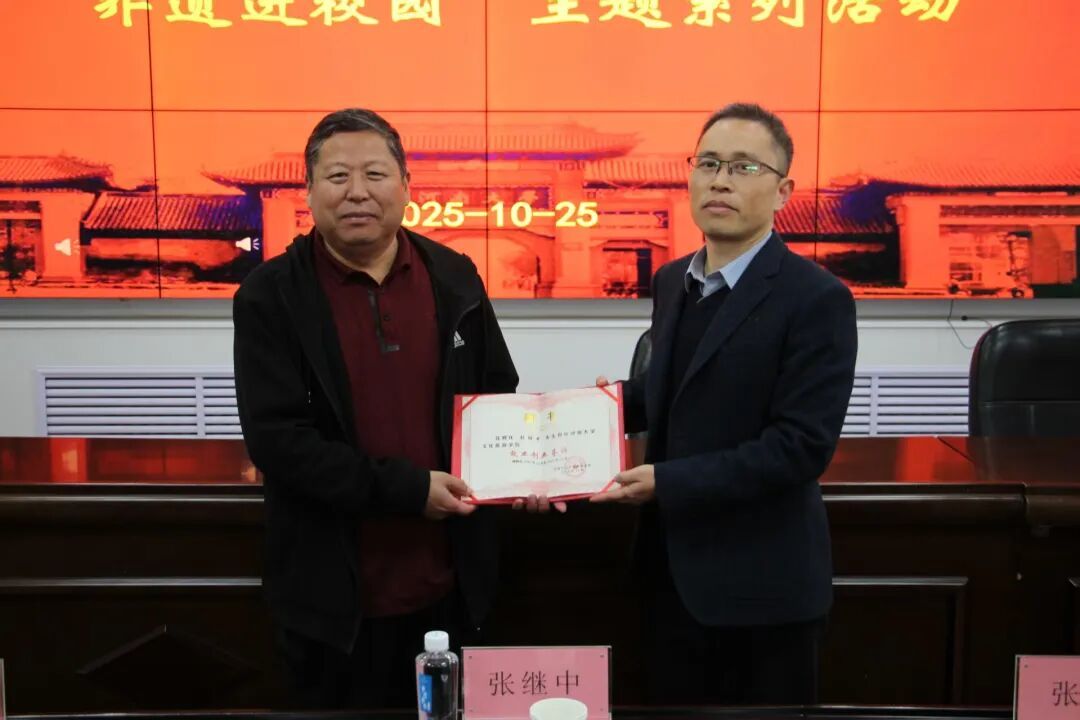 讲座正式开始前,刘英钦为三位传承人颁发聘书,正式聘请他们为学院校外实践和就业指导教师,旨在依托专家资源强化学生实践能力,搭建非遗传承与文旅人才培养的桥梁。