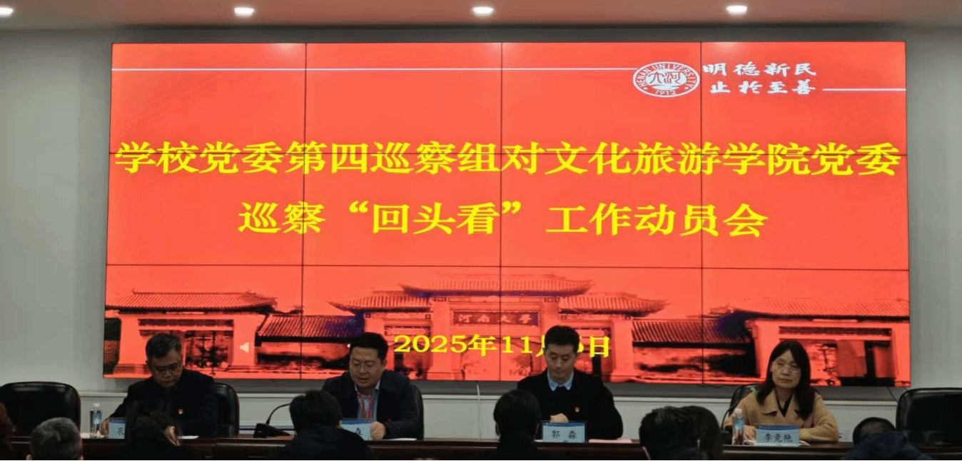 按照河南大学巡察“回头看”工作统一部署,11月6日下午,学校党委第四巡察组对文化旅游学院党委开展巡察“回头看”工作动员会在学院二楼会议室召开。校党委第四巡察组组长龚森,校党委组织部副部长、党委巡察工作办公室副主任郭淼,第四巡察组全体成员出席会议。学院全体领导班子成员、党支部书记、系(室)负责人及离退休代表、学生代表参加会议。会议由学院党委副书记、执行院长李竞艳主持。