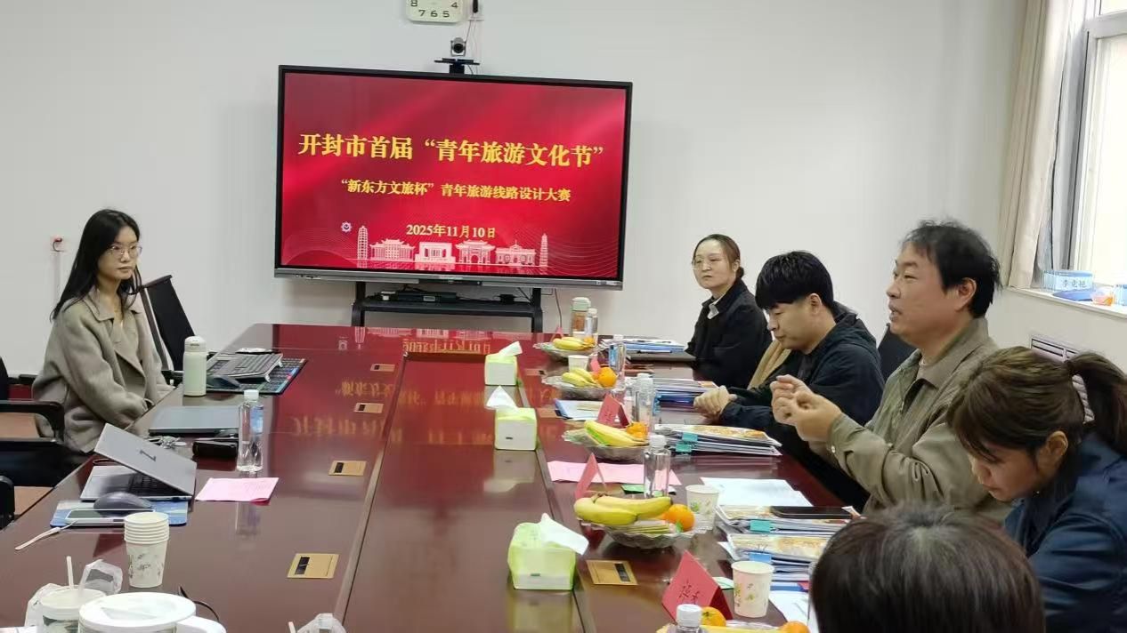 2025年11月10日上午8:30,由共青团开封市委、开封市文化广电和旅游局、河南大学联合主办的开封市“青年旅游文化节”“新东方文旅杯”青年旅游线路设计大赛在我院学院楼212会议室举行,开封古都学会副秘书长范启祥、开封文化职业技术学院传媒学院教研室主任张子慧、开封文投集团运营保障部经理李晶晶、开封市青年企业家协会副会长牛森、河南大学文化旅游学院副教授李昊出席会议,此次大赛由文化旅游学院高春留副教授主持。