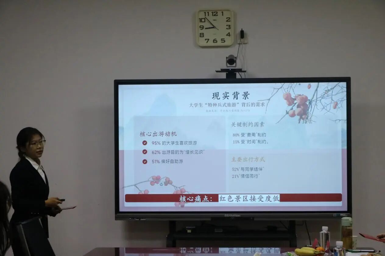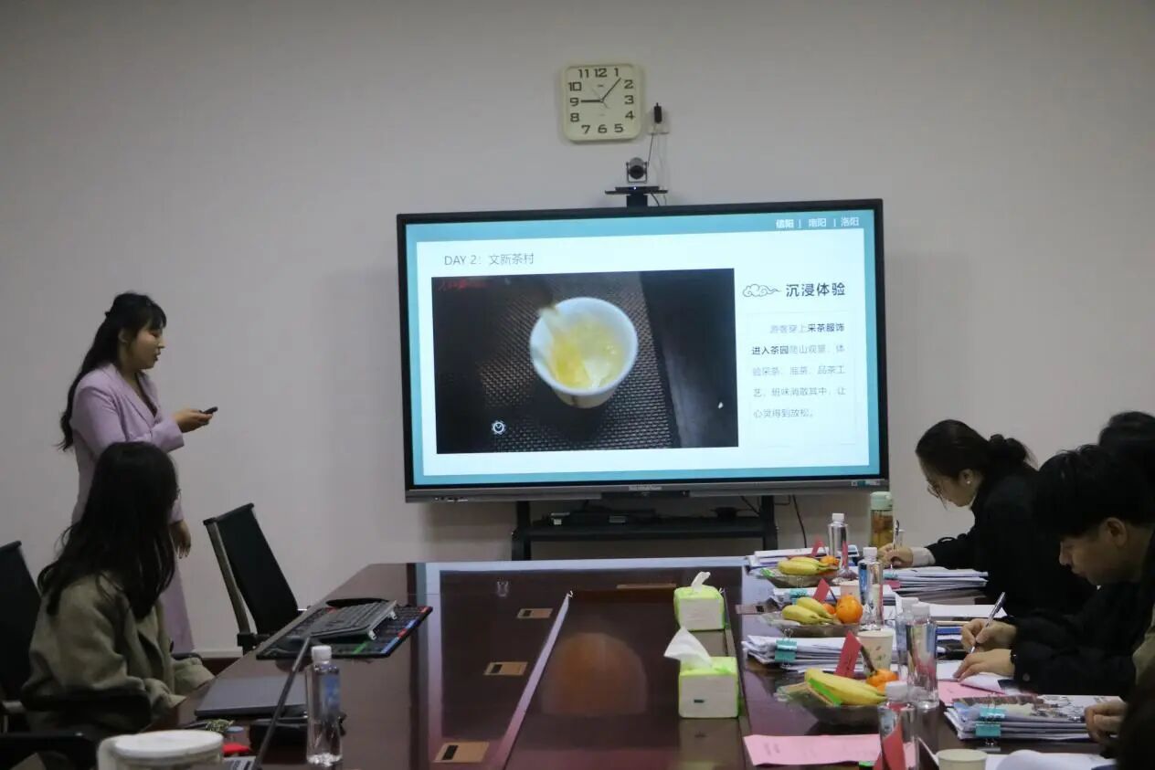 八仙过海,各显神通。由校内外同学组成的不同小组各自介绍了自己组的设计成果。“进步五人组”从逛古城、打卡古迹、旅游嗨玩三个角度带领我们玩转开封;“乐在途中组”从设计背景、设计理念、线路行程安排、线路特色、线路可行性分析六个方面入手带我们沿黄而行,探索黄河魅力;“西游八方录”红色盲盒乡旅线路将红色文化与旅游结合,以全盲盒体验带动大家的新鲜感;“感官调查组”设计的“五感律变凉心旅”将原生感、松弛感、存在感、氛围感、社交感融合在一起,让旅游者全神贯注地体味旅游过程;“与你相遇组”分享了一条为当代青年专属设计的全方位疗愈之旅——豫州疗愈之旅,最终实现身体放松、身体疗愈、精神升华的提升;“汴梁行者组”的主题为“古城六部中的宋风今韵”,主要探寻当今开封宋文化的回响;“遇见奇迹,揽胜中原”旅游线路,以“探索自然、传承文化、培养兴趣”为主题,开启“岩中游,游中岩”的正交云松深度游览之旅;“汴京红梦编制组”带领大家一起走进一场穿越时空的红色文化研学之旅——路同行,寻觅汴京红迹;“时空交响,遇见千年”旅游线路以“把河南当做历史文化宝库”为核心理念,借助沉浸式体验将各个景点串联,设计了这条“时空交响、遇见千年”的主题路线。