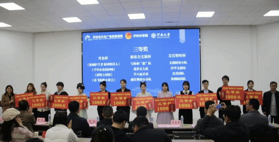 颁奖环节,参会学校职能部门和开封市共青团、文化广电和旅游局领导和企业嘉宾共同为决赛获奖的队伍代表颁发证书。