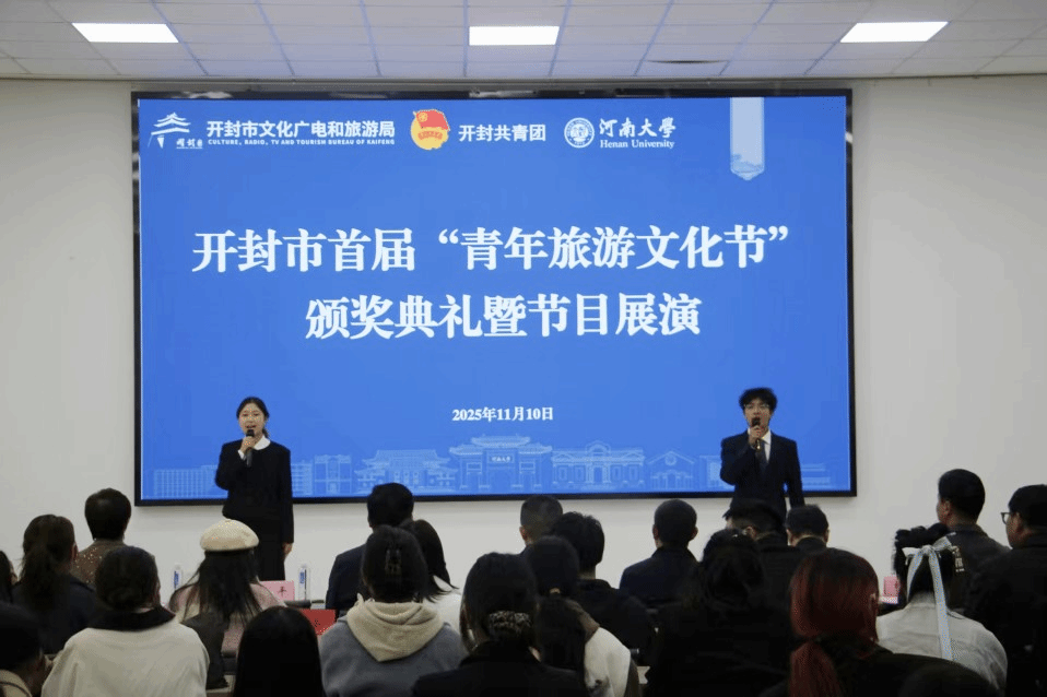 为响应河南省“文旅文创融合战略”和开封市“文旅强市”建设目标,搭建青年人才与城市发展双向赋能的桥梁。11月10日上午10:30,开封市首届“青年旅游文化节”颁奖典礼暨节目展演,在河南大学明伦校区科技馆一楼报告举行。共青团开封市委员会团委书记祁燃、开封市文化广电和旅游局副局长谢绍全,校团委书记龚森、教务处副处长朱显峰,河南新东方文旅经理张慧、文宣智库合伙人张晋、开封市青年企业家协会常务副会长张留洋,我院党委书记孔涛、执行院长李竞艳、党委副书记刘英钦、副院长张召鹏,开封市各入围决赛队伍及文化旅游学院师生参加活动,共同见证文旅融合的青春成果。活动由我院学生李晓羽、叶昊杰主持。