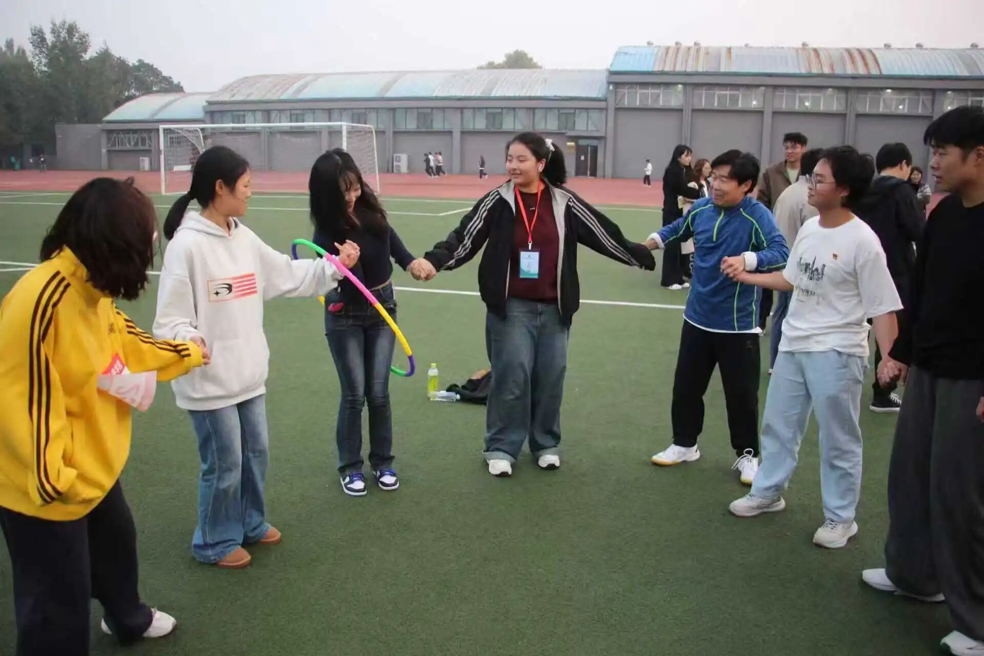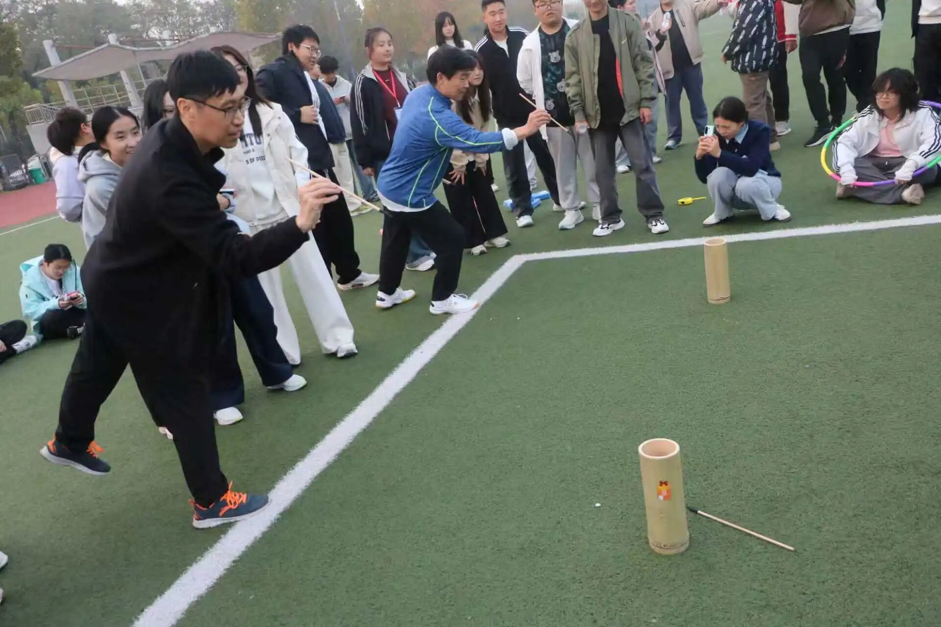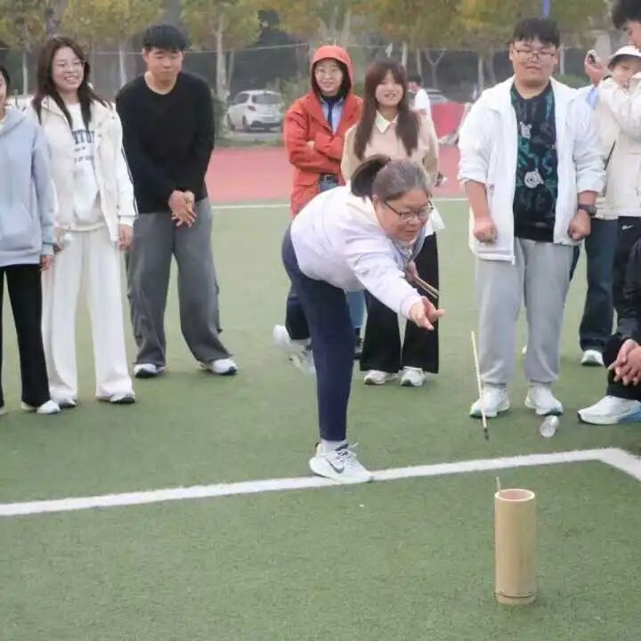 “一圈到底”项目中,师生手拉手围成圈,依次通过呼啦圈传递。过程中,大家默契调整姿势、灵活配合,现场笑声与加油声不断,投壶活动中大家站姿端正、屏息投箭,射中时欢呼雀跃。该活动不仅增添乐趣,更让师生近距离接触传统民俗。