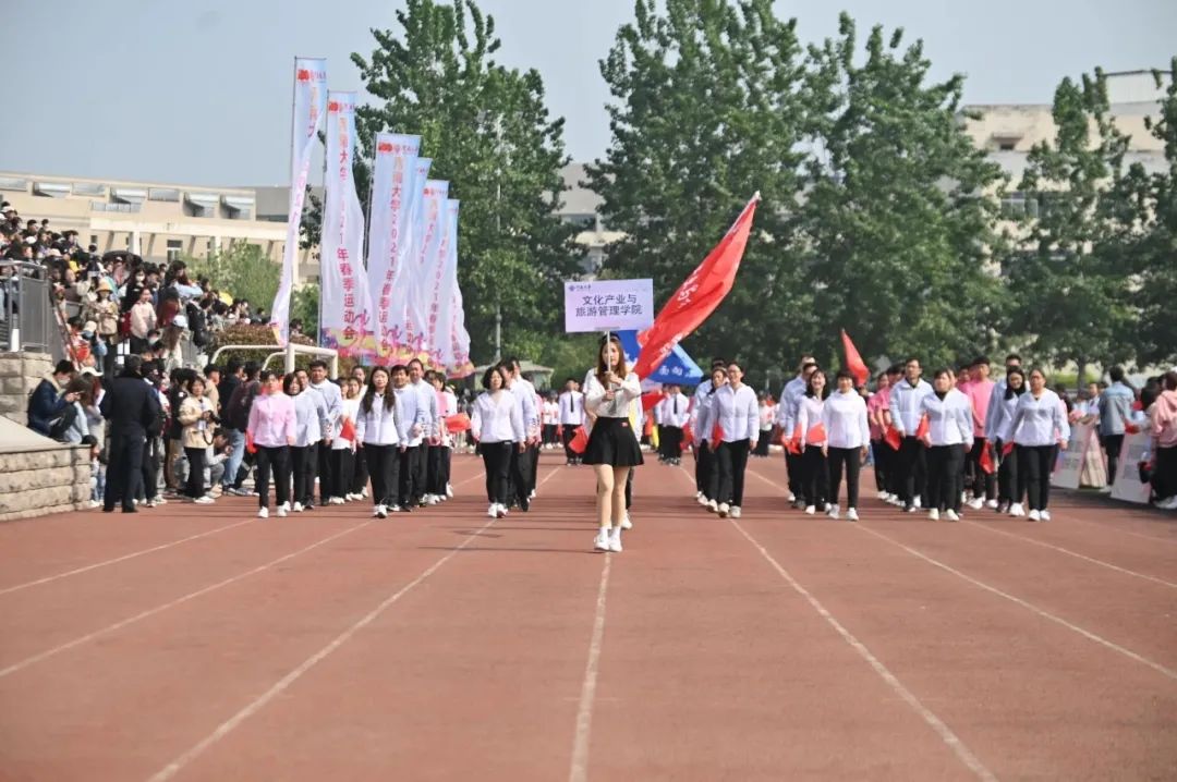 我院的方阵也在开幕式上给大家带来了精彩的亮相。我院师生身着粉白衣服,踏着整齐的步伐迎面走来,院旗高高飘扬,老师们手中的小红旗交相辉映。走到主席台前,队形变换,音乐响起,表演的同学们用激情的舞蹈展现少年的活力与激情,赢得了观众的热烈掌声。方阵表演展现了我们文旅学院别样的风采,昂扬的斗志,定能在运动赛场上大展身手。接下来,让我们跟随视频来欣赏一下学院方阵的风采吧!