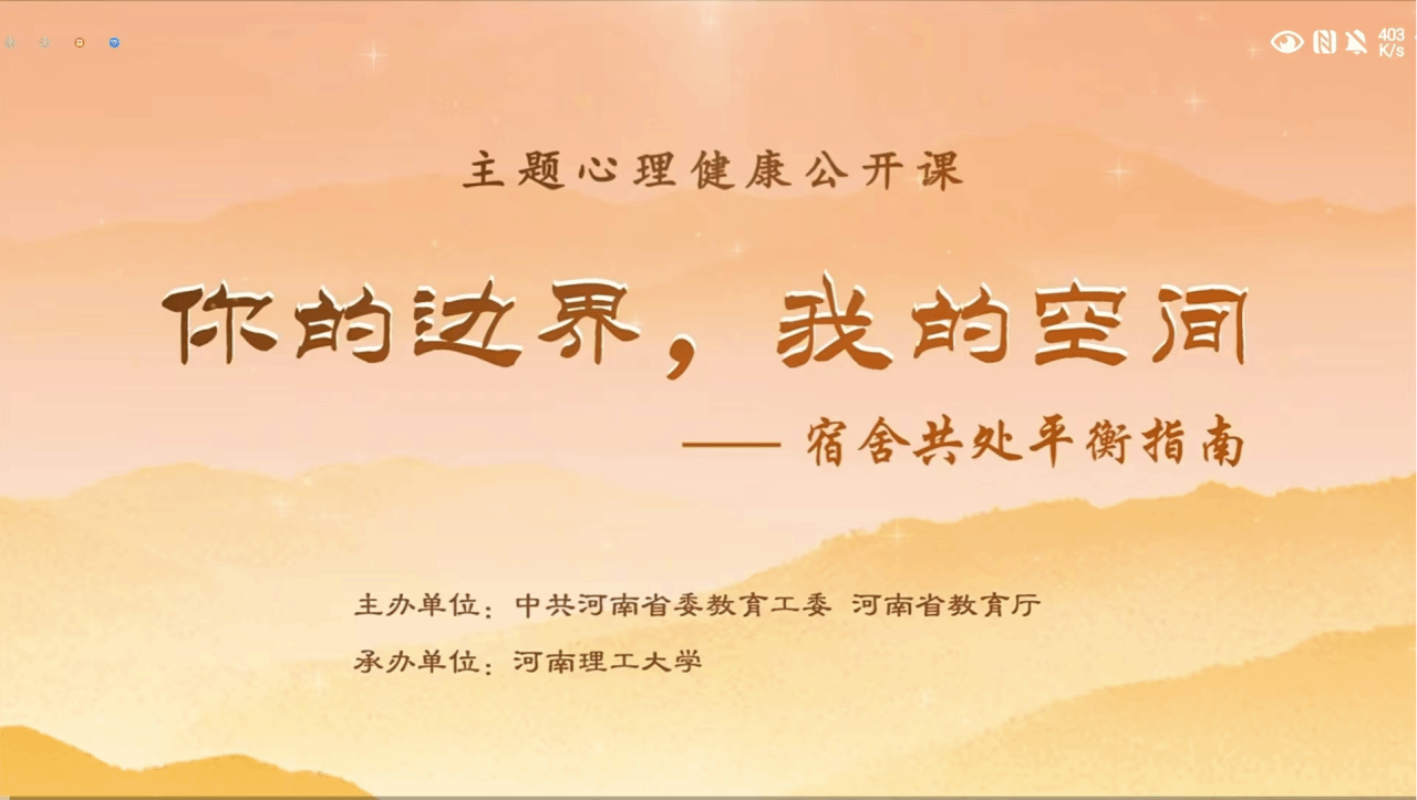 3月27日19:00,为引导学生树立健康的人际交往理念,营造和谐融洽的宿舍氛围,河南省教育工委、河南省教育厅主办的“你的边界,我的空间——宿舍共处平衡指南”主题心理健康公开课开播后,我院各年级学子积极观看学习,从课程中汲取宿舍相处的智慧,收获了诸多感悟与思考,纷纷分享了自己的学习心得。