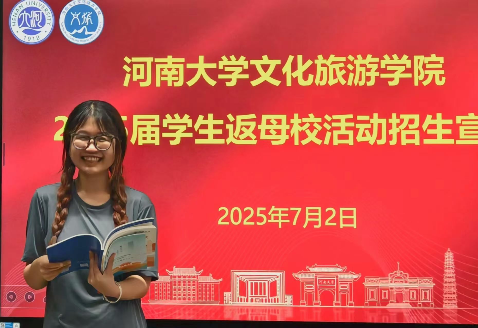 学子们带来了精心制作的宣传册、校园风光视频,还有亲手整理的“河大记忆”手账。从明伦校区的百年建筑讲起,那座见证了无数历史瞬间的大礼堂,青砖红瓦间藏着的是河大与时代同频的故事;说到金明校区的现代化教学楼,实验室里的灯光、图书馆里的书香,都是学术路上最温暖的陪伴。作为文化旅游学院的学生,他们特别分享了专业学习的乐趣:在旅游管理课堂上模拟景区运营,在文化产业管理课程中设计文创产品,还有那些走出校园的实践课——跟着老师考察古村落、策划文旅活动,课本里的知识就这样变成了触手可及的成长。